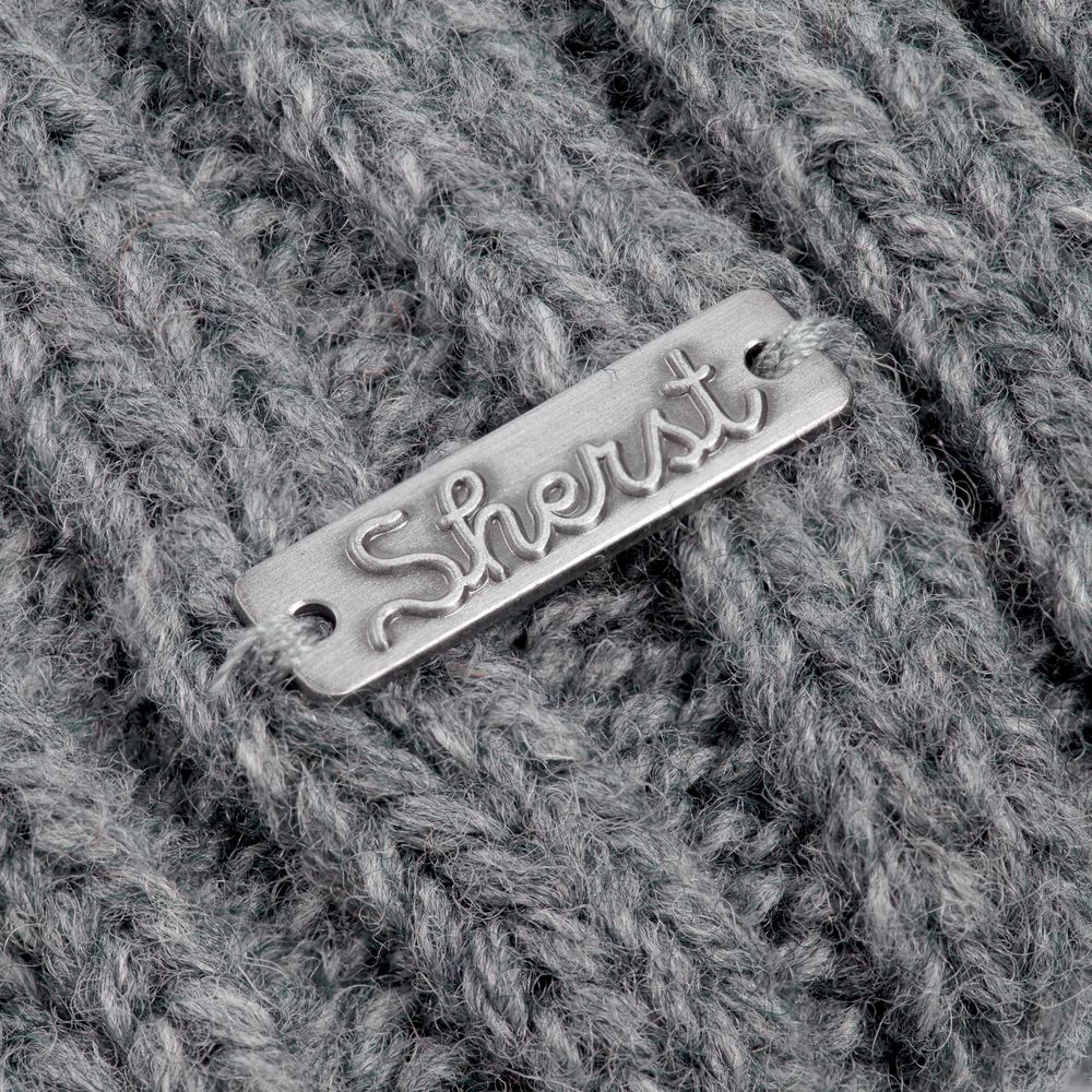 Металлический шильд с названием бренда расположен у заднего шва шапки. Это оставляет место спереди для пришива лейбла или шильдика с логотипом заказчика.