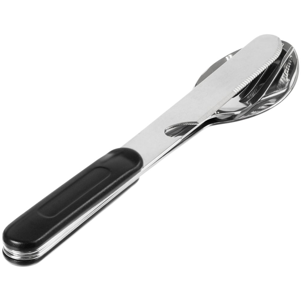 Набор столовых приборов из ложки, вилки и ножа с открывашкой с разборной конструкцией.