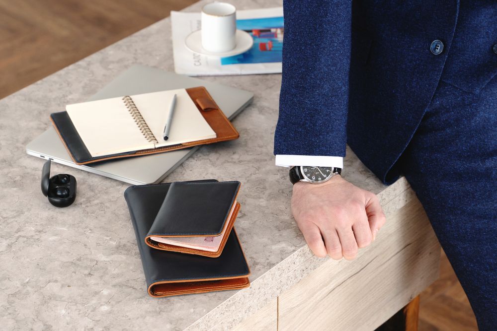 Чтобы передать этот удивительный контраст, для изделий Kalsa Palermo была выбрана гладкая натуральная кожа: глубокого синего цвета снаружи и светло-коричневого оттенка внутри. Оформленные в едином стиле, они легко собираются в подарочные наборы.