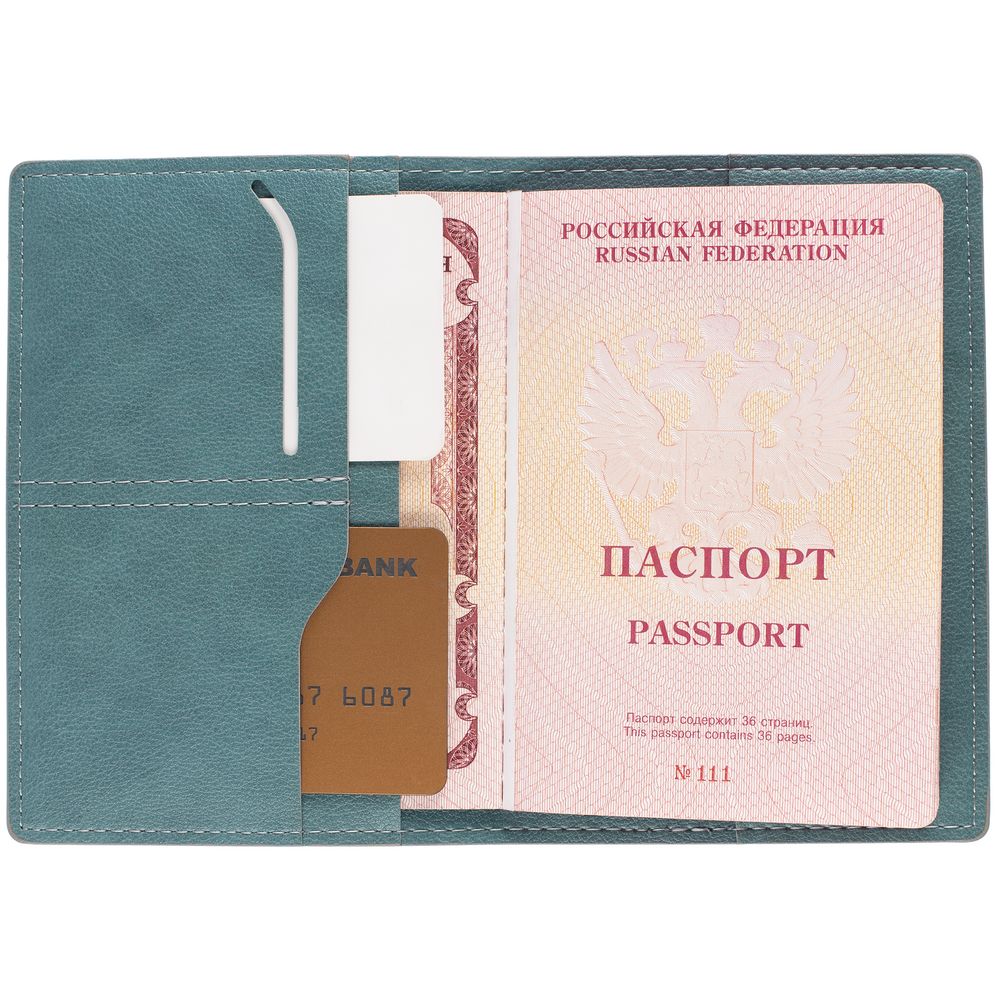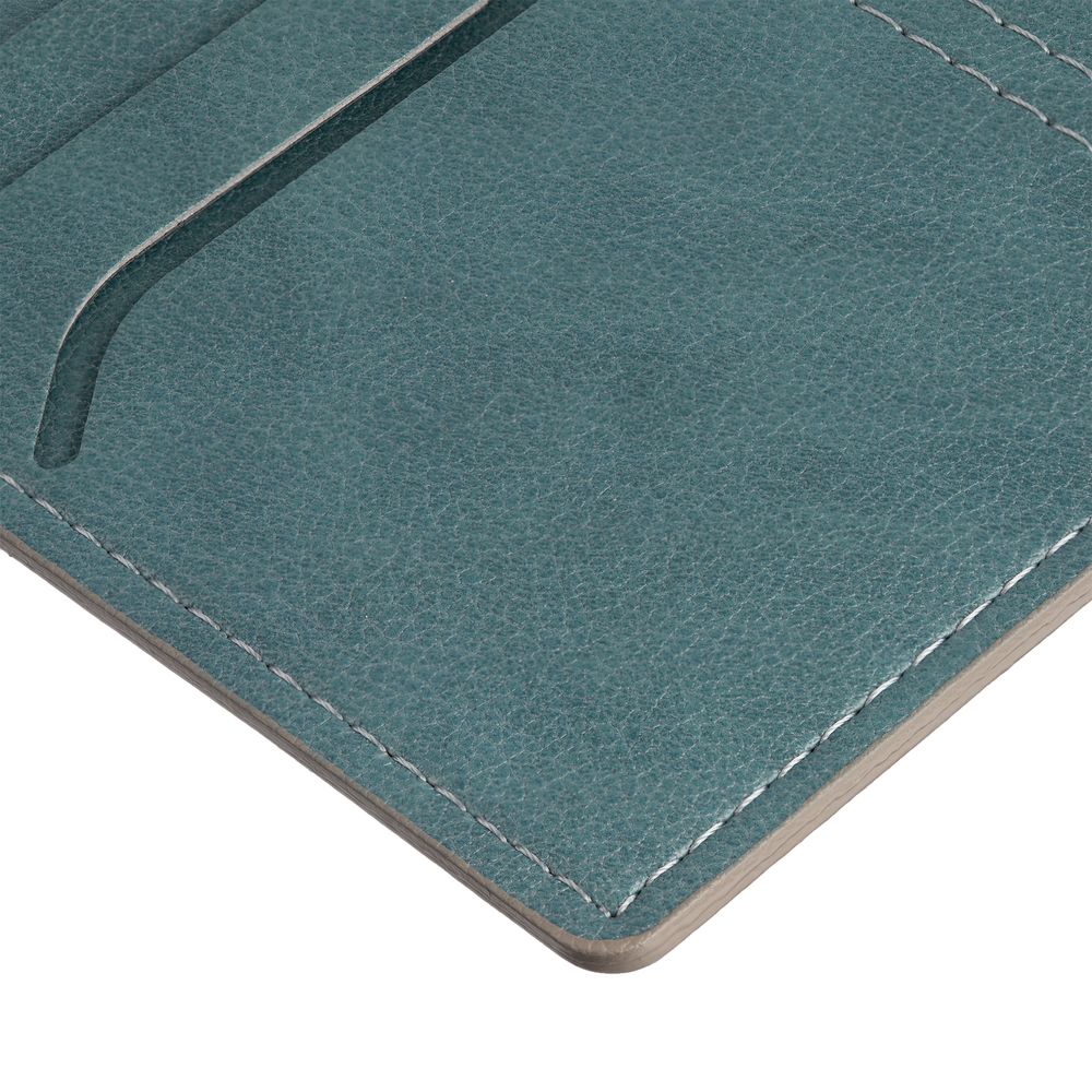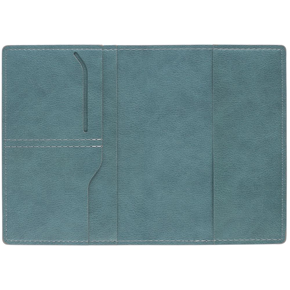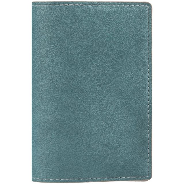 Обложка выполнена из материала Petrus, голубой JJ. Срез обложки окрашен в серый цвет.Имеет основное отделение для паспорта и 2 кармана для визиток или кредитных карт.