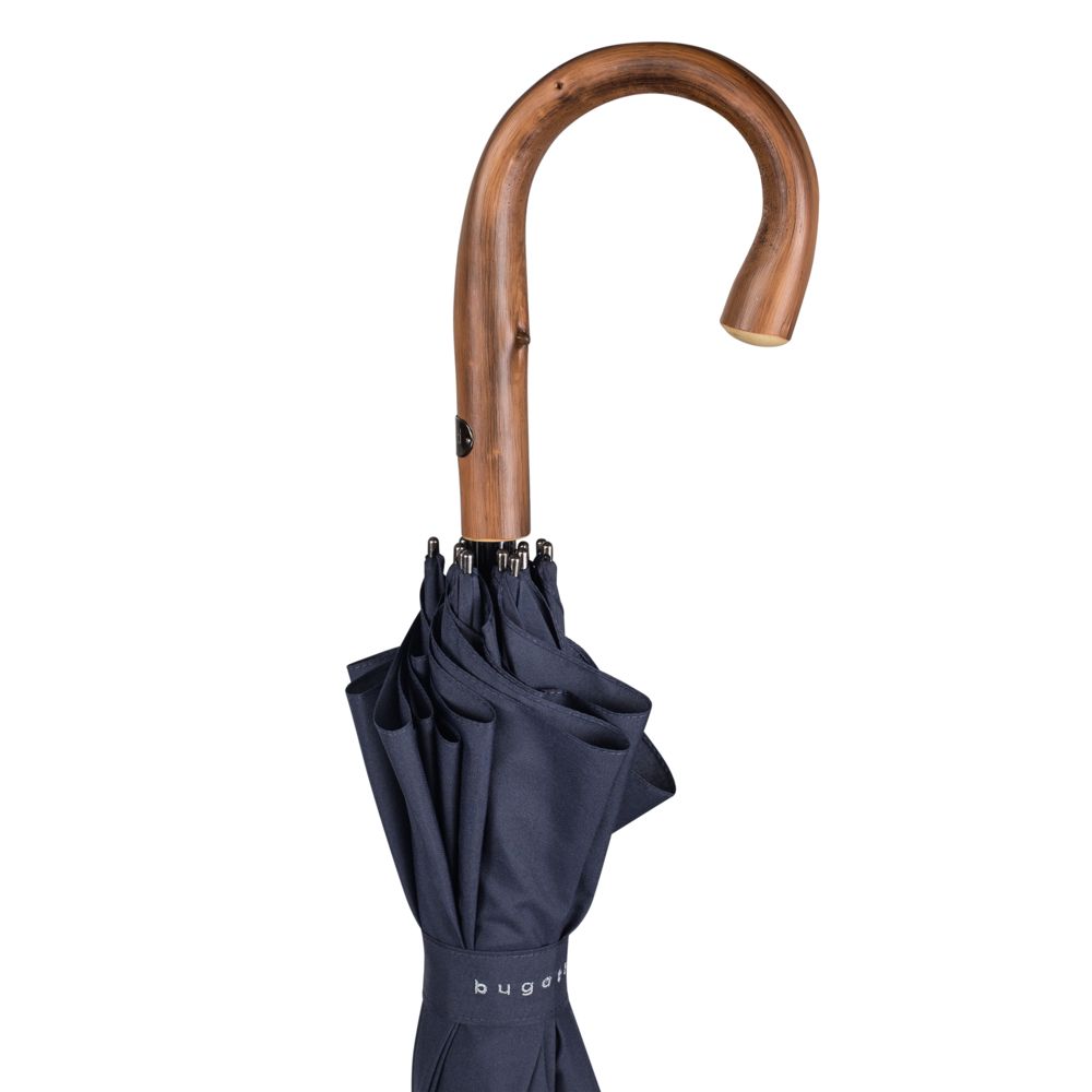 Солидный изысканный зонт с ручкой из дерева и 16 спицами. Большой купол легко укроет от дождя сразу двоих, а надежная конструкция выдержит даже сильный ветер.