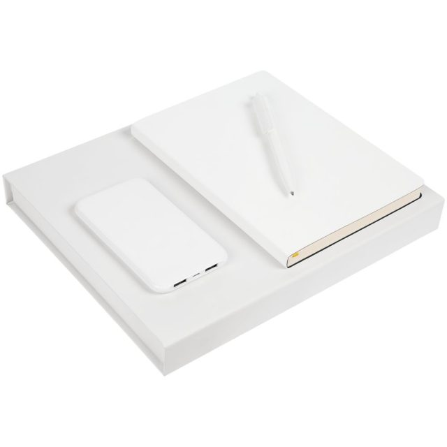 ежедневник — искусственная кожа; ручка — пластик; внешний аккумулятор — покрытие софт-тач, пластик; коробка — переплетный картон, покрытие софт-тач