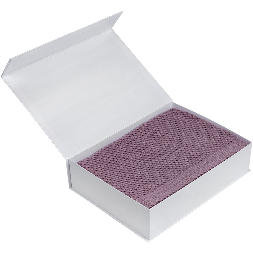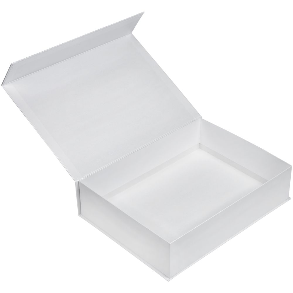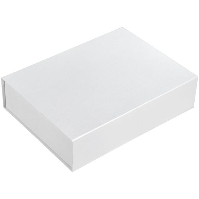 Коробка изготовлена из переплетного картона, кашированного дизайнерской бумагой Majestic цвета «Белый мрамор».
