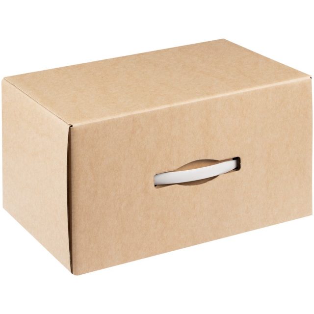 Самосборная коробка-шкатулка со вставной пластиковой ручкой.