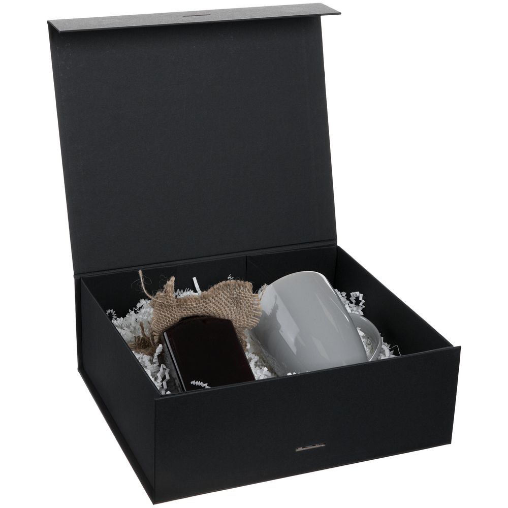 Коробка из переплетного картона, кашированного тонированной в массе крафтовой бумагой. Крышка на двух магнитах дополнительно фиксируется репсовой лентой.Толщина картона 2 мм.