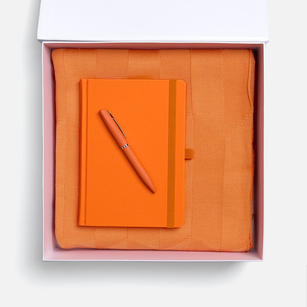 Однотонный набор с основной канцелярией и пледом — классика жанра в уютном исполнении. С компактным ежедневинком будет удобно делать заметки в любое время — благодаря петельке для ручки любимый пишущий инструмент будет всегда под рукой. А изысканный акриловый плед с геометрическим узором позволит выразить самые теплые пожелания и ддобавит плавных линий в интерьер.