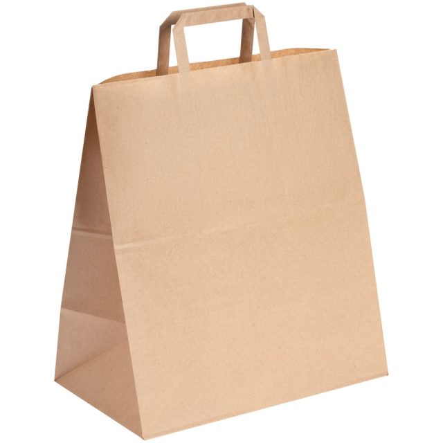 Бумажный пакет с плоскими ручками.Выдерживает нагрузку до 2 кг.