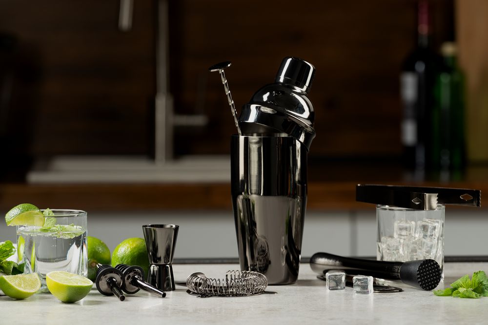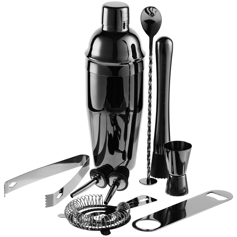 шейкер: диаметр 8,1 см, высота 24 см; джиггер 3,8х3,8х6,8 см; барная ложка 25,5 см; гейзер 10,8х2,9х2,9 см; мадлер 20,5х3,4х3,4 см; щипцы 16х1,8 см; открывашка 18х4 см; упаковка 28х11х11 см