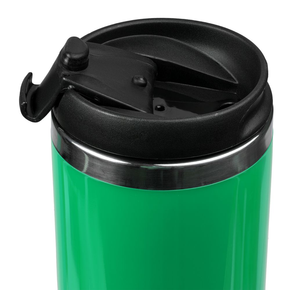 Двухслойная конструкция из пластика снаружи и пищевой нержавеющей стали внутри. Герметичная завинчивающаяся крышка с откидным клапаном для питья.