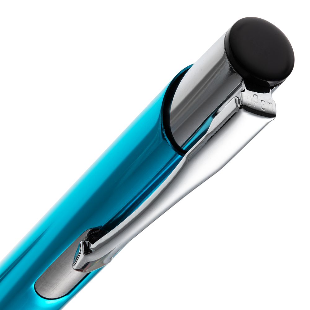 Яркая шариковая ручка с глянцевым цветным корпусом и хромированными деталями.