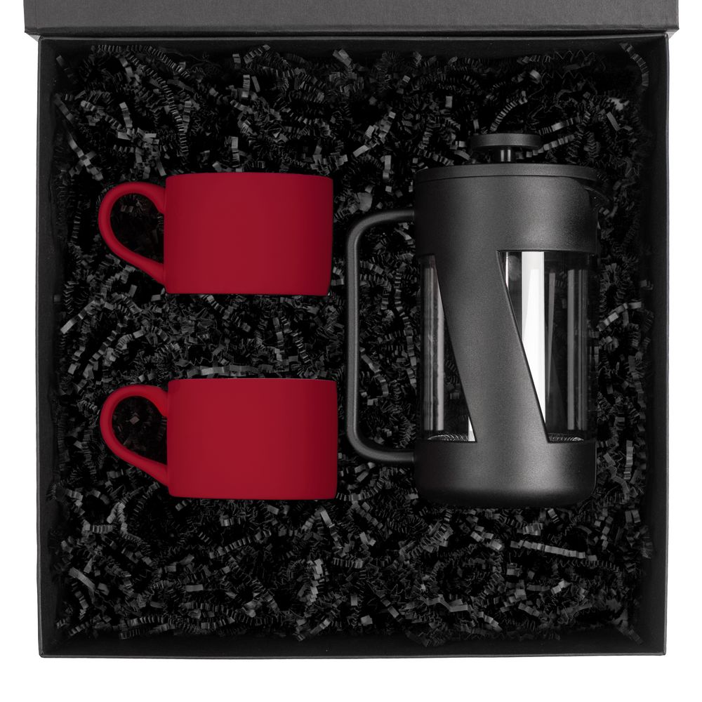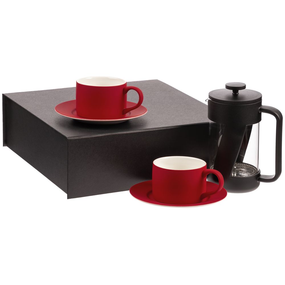 покрытие софт-тач; чайная пара — фарфор; френч-пресс — боросиликатное стекло, пластик, нержавеющая сталь; коробка — переплетный картон