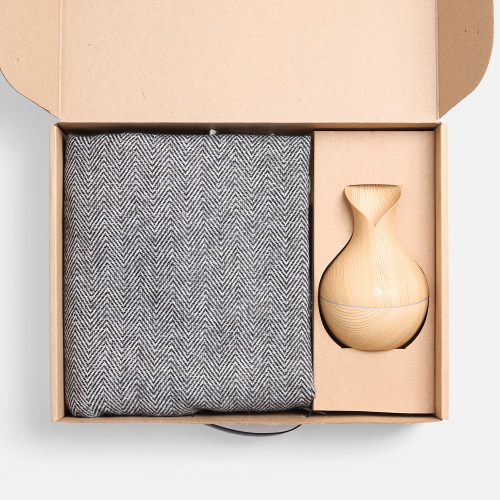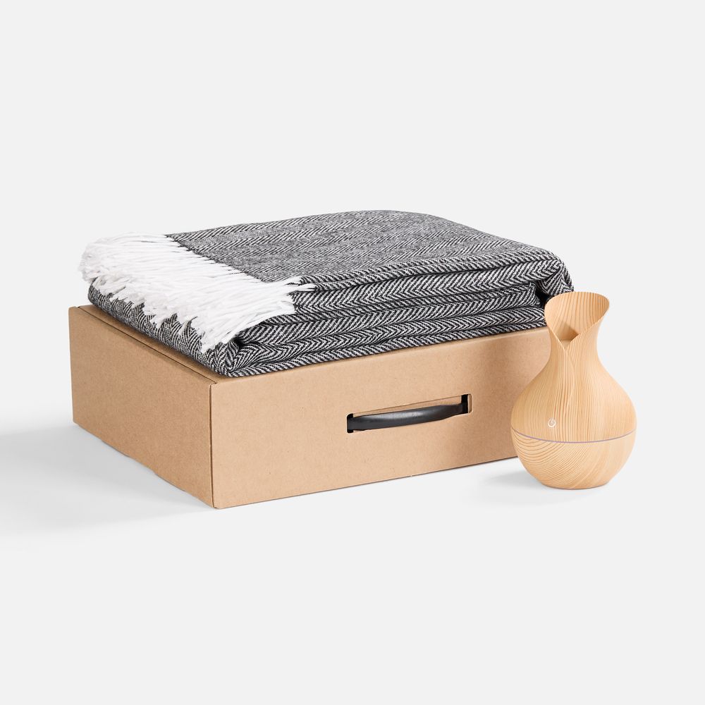 Мягкий плед нежных оттенков подарит тепло и комфорт, а изящный увлажнитель наполнит воздух свежестью и приятным ароматом. Этот набор — гармония красоты и функциональности, которая превращает каждый момент в отдых и восстановление.