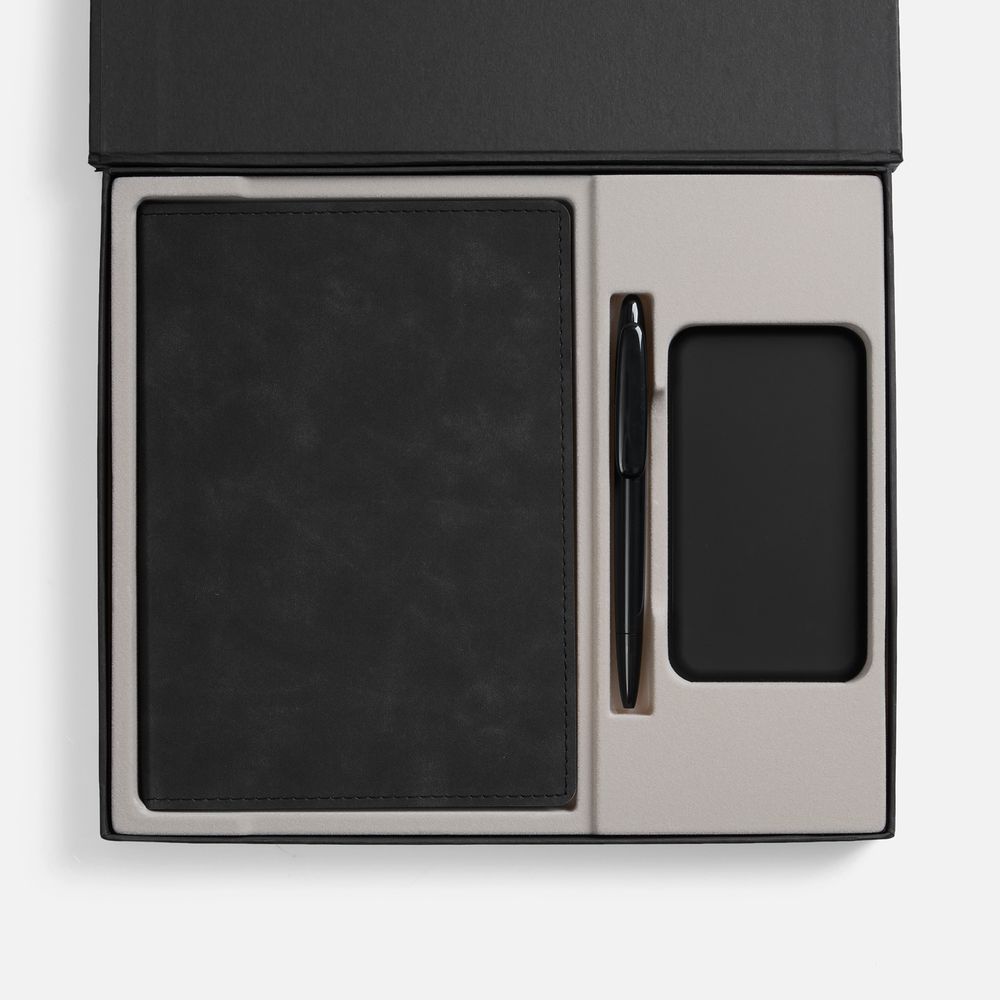 Набор с внешним аккумулятором позволит всегда оставаться на связи, а бессменная офисная классика — ежедневник и ручка —помогут направить энергию в правильное русло!
