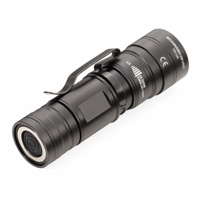 Компактный фонарь в прочном металлическом корпусе с 6-кратным телескопическим зумом для регулировки дальности луча. Магнитный колпачок в торце фонарика позволяет быстро зафиксировать его на металлических поверхностях и освободить обе руки, например, при работе под капотом машины или под раковиной.