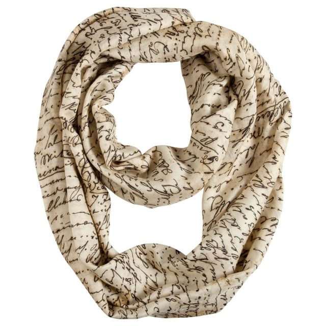 Шарф-снуд сшит по принципу ленты Мебиуса: перекрученное замкнутое кольцо. Именно поэтому он ложится на плечи красивыми складками.