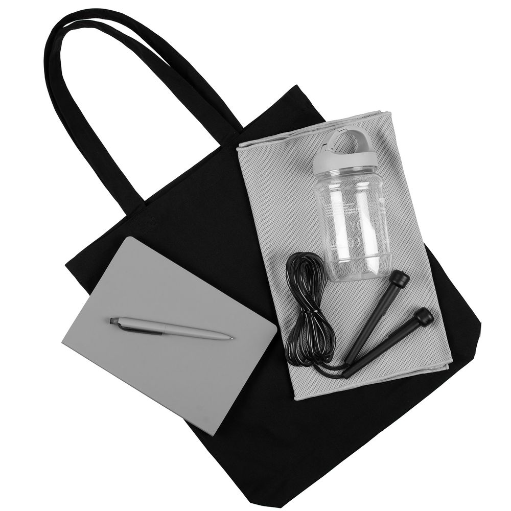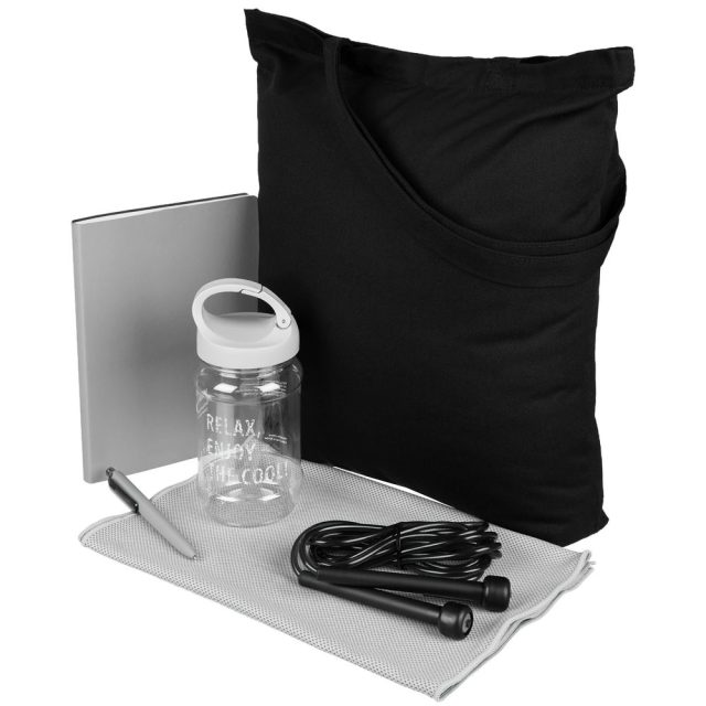 | Материал | скакалка — ПВХ, пластик; полотенце — полиэстер; ежедневник — искусственная кожа, покрытие софт-тач; ручка — пластик, покрытие софт-тач; сумка — хлопок 100%, покрытие софт-тач |