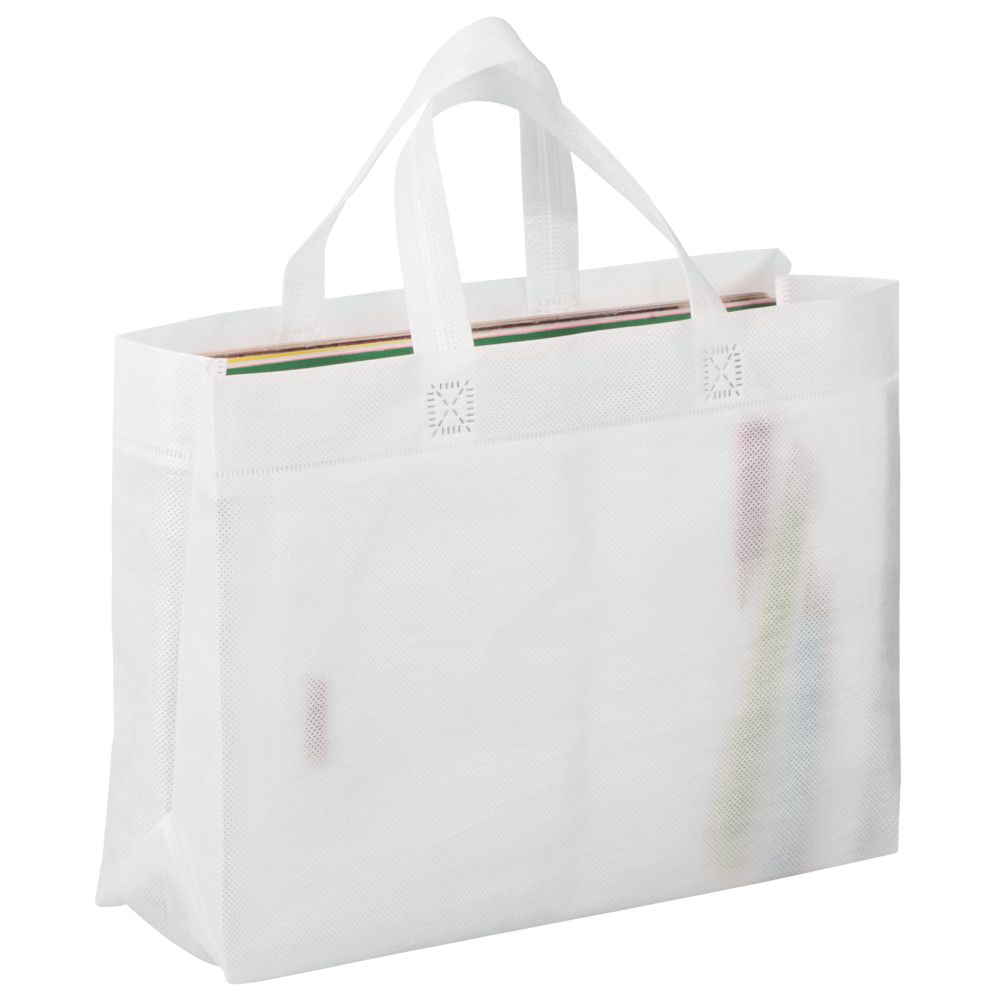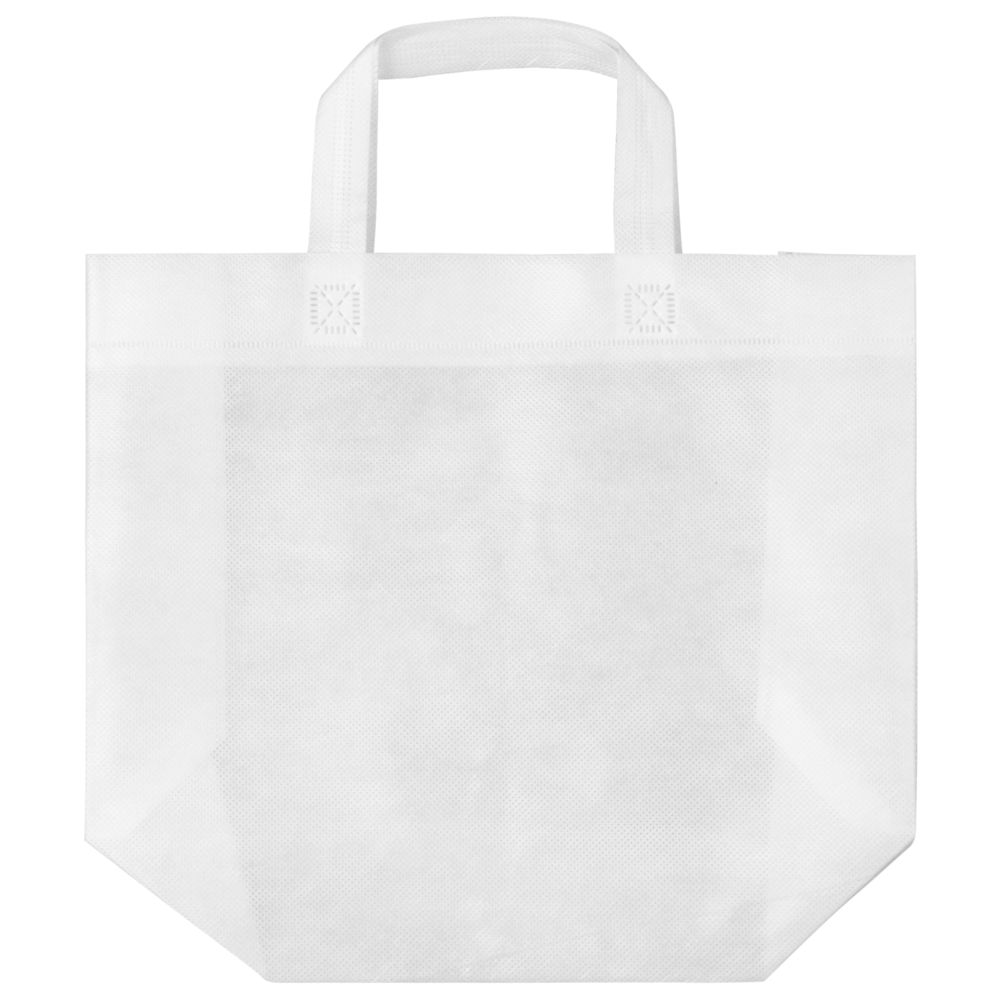 Небольшая сумка из спанбонда выдерживает нагрузку до 12 кг. Благодаря своей форме и размеру отлично подходит для упаковки подарков или полиграфических материалов.