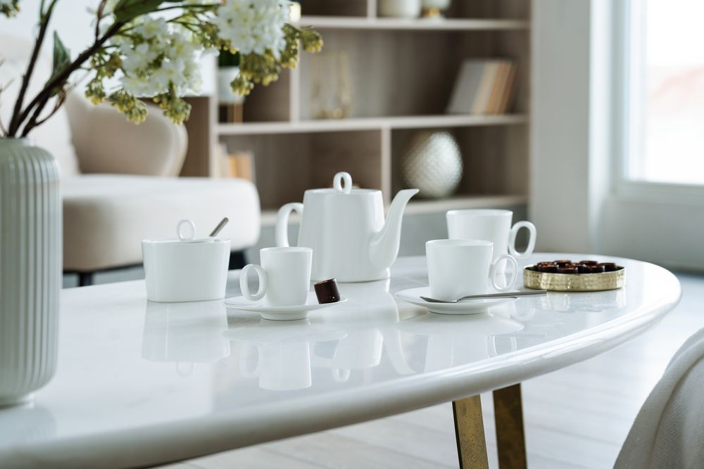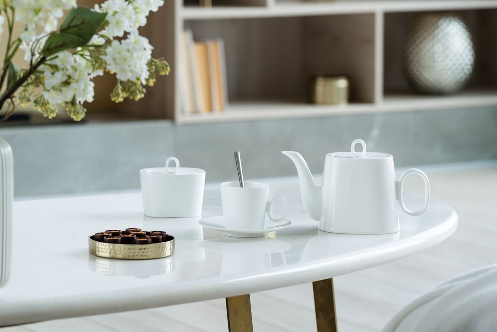 Благодаря особой форме у чайника и сахарницы Frammenti увеличено место для персонализации: эти предметы почти всегда остаются на столе, поэтому логотип будет на виду как можно дольше.