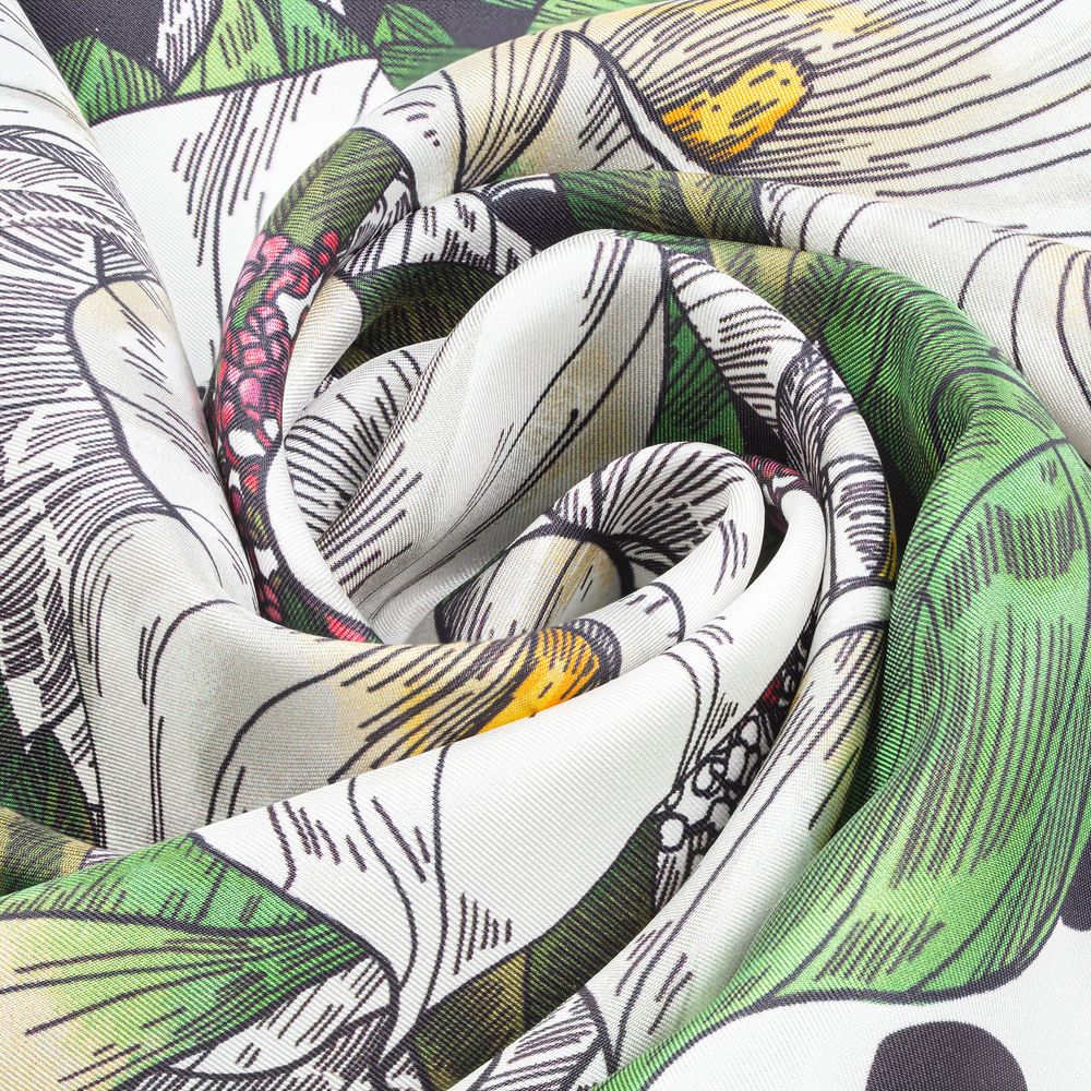 Шелковый платок с цветочным принтом открывает простор фантазии — его можно использовать как шарф, головной убор или декоративный элемент для верхней одежды и аксессуаров.