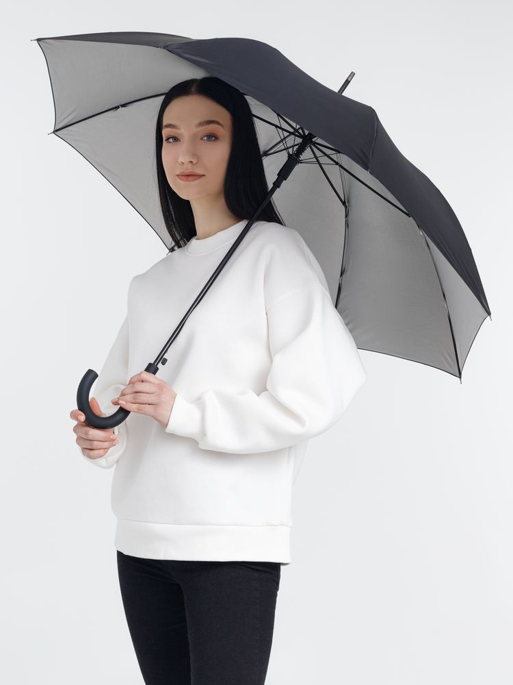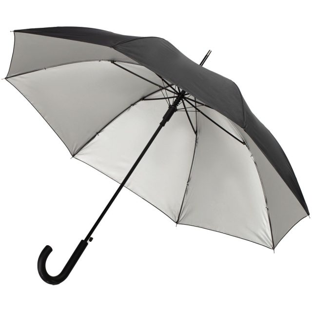 Легкий зонт-трость классической формы, который выглядит нескучно благодаря современным деталям исполнения — серебристому покрытию на внутренней части купола и мягкой прорезиненной ручке.